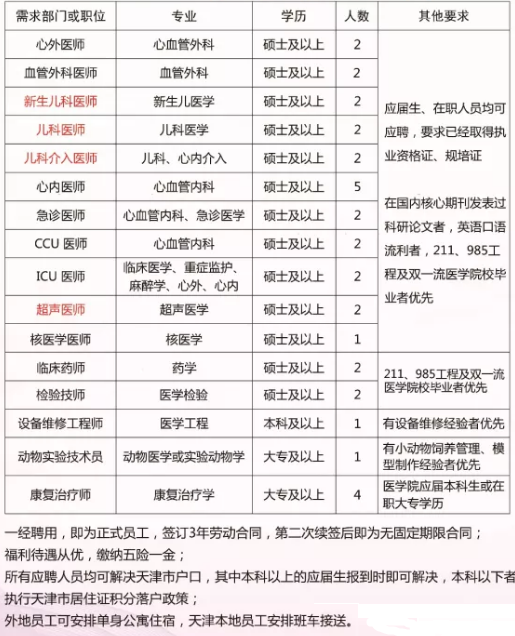 简历邮寄地址:天津经济技术开发区第三大街61号泰达国际心血管病医院人力资源部