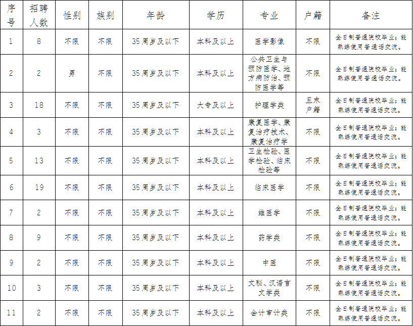 | 招聘人数 | 性别 | 族别 | 年龄 | 学历 | 专业 | 备注 |