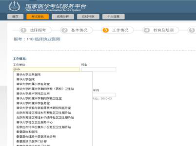 答:在系统中以上两者的填写方式相同。如填写工作单位,在网上报名系统中“工作单位”可以通过输入拼音首字母或直接填写工作单位名称的方式检索,在查询到的下拉框中选择您的工作单位即可。当鼠标从工作单位项移开后,如果工作单位文本框显示黄色表示您输入的工作单位没有收录在网站工作单位字典中(若出现此种情况,请您仔细核对输入的工作单位是否有误,若确认无误,则需申请添加数据,请按系统提示登陆相关链接进行相应的操作。考生可待后台数据库添加成功后在菜单中选择。);显示红色表示您未输入工作单位;显示灰色表示您选择的工作单位存在系统中并可以使用。如下图: