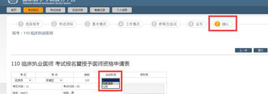 答:报考临床执业医师且在院前急救或儿科岗位的考生可以申请参加短线医学专业加试,网上填报时,在报名的第七步确认时,在表中选院前急救或儿科加试。参加短线医学专业加试的考生,如通过加试获得医师资格,限定在加试的专业或岗位范围内执业,如需变更执业范围需重新参加医师资格考试获取医师资格。如下图: