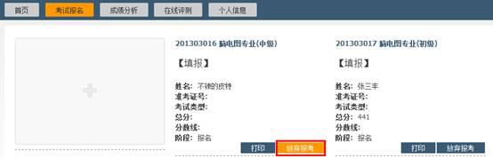 答:如需修改个人报名信息,须在网上报名截止日前,再次登陆服务平台,进入“考试报名”栏目,在需要修改的报名下方点击“放弃报考”,然后再重新报名,报名成功后需重新打印《医师资格考试报名暨授予医师资格申请表》。如下图: