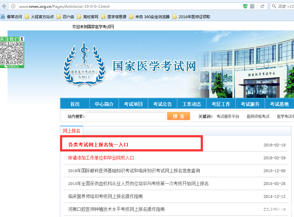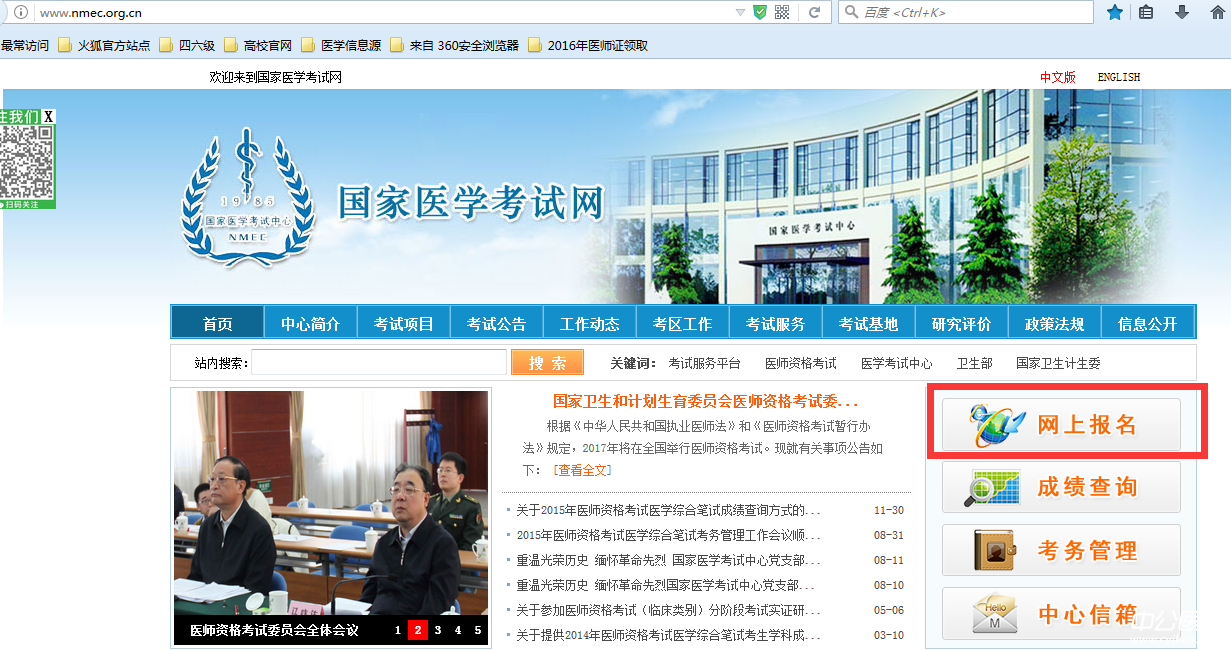 一、登录国家医学考试网(网址是:http://www.nmec.org.cn/),点击:“网上报名”;