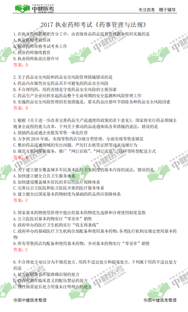 中国人事考试网:2017执业药师《药事管理与法规》考试试题\试题解析