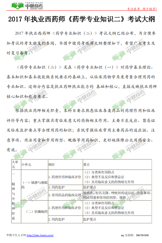 中国卫生人才网:2018年执业药师《药学专业知识二》考试大纲