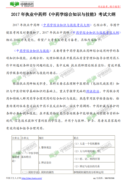 由中国卫生人才网为您整理,根据2017年执业中药师《中药学综合知识与技能》考试大纲整理,2018年执业中药师《中药学综合知识与技能》考试大纲。为了方便考生备考,华图中国卫生人才网小编为大家编辑整理了2018年药师考试大纲,考生可免费进行2018年药师考试大纲下载或复制。2018年全国执业药师考试群:586783506